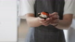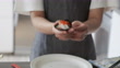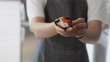 Beautiful Japanese female cook and influencer is doing a virtual cooking class event held at her home studio and broadcasted to her class members online. She cooks Japanese food - temaki and gyoza. Whole series shot with different angles and details.