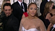 2011: GOLDEN GLOBE AWARDS ARRIVALS: HD: MCU PAN Jennifer Lopez walks down the red carpet smiling, waving & talking to paparazzi with husband Marc Anthony (BG) and handler at the Beverly Hilton Hotel
