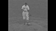 MS Joe Dimaggio wearing suit smiling and giving a wave / various shots of Dimaggio wearing chef's coat and apron with a toque on his head as he cooks spaghetti and then serves it up on a plate and places it on pick-up shelf in the kitchen / Dimaggio takes order from diner / Dimaggio sits at a desk as he punches keys on a cash register // pan of New York Yankees standing in a line with caps over their hearts at season opener in Boston / CU Yankee manager Joe McCarthy giving a hand gesture amically signaling his refusal to talk about Dimaggio / CU Yankee Myril Hoag smiling / Charles F Hurley, governor of Massachusetts, throws out first ball / MS pan of front rows with women wearing corsages, one has newspaper tented over her head, three others huddle under an umbrella in the rain / Jim Bagby pitches for Red Sox / Yankee Red Ruffing pitches / birdseye view of stands and diamond as Bobby Doerr bats for Red Sox and two runs are scored / Red Sox player bats ball in play on the diamond / Yankee player begins pitch