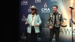 NASHVILLE, TENNESSEE - NOVEMBER 08: (L-R) John Osborne and T.J. Osborne of The Brothers Osborne pose withthe Vocal Duo of the Year award in the pressroom of the 57th Annual CMA Awards at Bridgestone Arena on November 08, 2023 in Nashville, Tennessee. (Footage by New Vision/Getty Images)