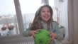 Joyful Little Girl Laughing and Playing with a Green Ball at Home - 4K stock video