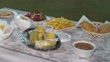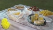 Medium shot panning over a June festival table with savory and sweet typical dishes.