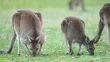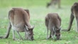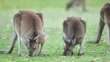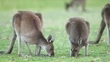 In the cool morning light, a Western Grey kangaroo (Macropus fuliginosus) crouches low, nibbling on dew-covered grass. Its powerful forepaws tug gently at the greenery, while its large ears twitch at the distant rustle of leaves. Found across the southern part of Australia, this common marsupial moves with quiet grace, its soft grey-brown fur blending into the muted tones of the bushland.