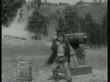 B/W 1915 Keystone Kops running toward man fretting near cannon on grassy hill in foreground / feature - stock video