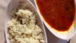 Kidney bean curry or rajma or rajmah chawal table top spin isolated on white background.