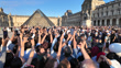PARIS, FRANCE - JULY 14: Kim Seok-Jin, member of the Korean group BTS, bearer of the Olympic torch runs during the Olympic flame parade in front of the pyramid of the Louvre museum on July 14, 2024 in Paris, France. The Olympic Flame arrived in Paris on July 14 to be integrated into the Bastille Day celebrations. This includes the traditional grand military parade on the Champs-Élysées, which is featuring the Olympic Torch as part of its route. The torch is planned to be carried through iconic locations in Paris, such as La Place de La Concorde, Notre Dame, Bataclan, Bastille, Assemblée Nationale, and the Musée Carnavalet. Additionally, the Eiffel Tower is hosting a special fireworks display, celebrating both Bastille Day and the upcoming Olympics with a theme centered around "Liberty." (Footage by Photo and Co/Getty Images)