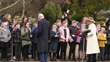 King and Queen Consort visit Colchester; ENGLAND: Essex: Colchester: Colchester Castle: EXTKing Charles III and Camilla, Queen Consort, from car and greeting soldiers and others at castle entrance (some shouting from anti-monarchy protesters heard) / Camilla presented with flowers / King and Queen Consort greet group of schoolchildren waving Union Jack flags / King and Queen Consort chatting with members of public /