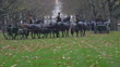 King Charles III birthday: Gun salute in Green Park; ENGLAND: London: Green Park: EXTThe King's Troop Royal Horse Artillery turn around and stand in formation / Horses arrive to collect carriage / Carriages connected to horses /