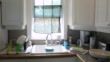 Kitchen sink and counter with water running and curtain blowing briskly - 4K stock video