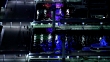 Pan up from sea surface to the illuminated Kobe Port Tower with busy Hanshin Expressway in the background