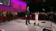 Wide shot conference hall, delegates applauding and standing as Ed Miliband MP (Labour Party leader) introduced to stage