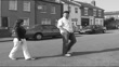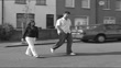 GRAPHICISED SEQUENCE B/W footage of Emily Droy next David Bryan Magee (Their car was towed away and crushed by Lambeth Council while they were away on holiday) along across road