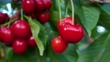 Close-up of large ripe cherries on branches with green leaves on a cherry tree