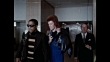David Bowie, wearing blue dungarees and platforms, exits a hotel and gets into the back seat of a car