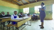 Rural African School Classroom full of teenagers in school uniform with hands raised. They are sitting together on wooden desks. The children are all between 14 -17 years old. There is light falling in from the window. The children are eager to learn and want the female teacher’s attention. The school is in a rural setting outside Malealea in Lesotho, Africa.