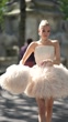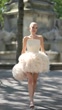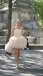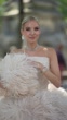 PARIS, FRANCE - JULY 06: (SLOW-MO) Leonie Hanne wears a diamonds large rose flower with fringe pendant earring, a large diamonds necklace, a white latte shoulder-off / corset top / oversized fluffy feathers puffy short dress, a matching white latte oversized fluffy feathers handbag, a silver watch, a gold Juste Un Clou bracelet from Cartier, a gold Love bracelet from Cartier, gold rings from Cartier, a diamonds bracelet, silver shiny leather straps with embroidered rhinestones heels sandals , outside Ashi Studio, during the Haute Couture Fall/Winter 2023/2024 as part of Paris Fashion Week on July 06, 2023 in Paris, France. (Footage by Edward Berthelot/Getty Images)