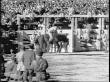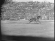 Lieutenant Dick Ryan climbing on Emperor Hirohito's horse / Ryan rides horse past crowd in stadium / close up of Japanese children in audience / Ryan riding horse across stadium / view of soldiers watching from sidelines / view of soldiers watching from stands / rider comes out of gate on bronco and gets bucked off / bronco runs across stadium / close up of soldiers in stands / man on bronco rides across stadium, bronco runs toward crowd after throwing rider off.