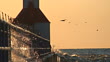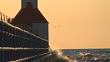 Waves splash against seawall as gulls fly around the lighthouse at St. Joseph, Michigan on Lake Michigan.