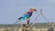 Lilac Breasted Roller (Coracias caudata), adult on tree feeding alert, Kruger Nationalpark, South Africa, Africa