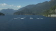4K drone footage of a line of boats speeding past mountains, trees, a hydro building with a stunning background of snowcapped peaks.