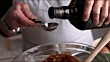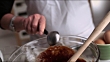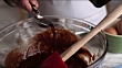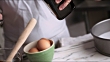 One of a series of shots showcasing the creation of a flourless dark chocolate cake by a female chef / baker in a high end professional / home kitchen environment. Shot features a liqueur being poured, measured and added to liquid batter. There are additional shots of this process in the series.