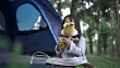 Little girl playing rabbit doll during camping in the forest - 4K stock video