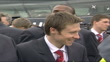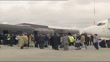 Liverpool FC players down plane steps PAN DOWN to players and press on tarmac / Gerard Houllier (Liverpool FC Manager) holding UEFA cup as down plane steps / Robbie Fowler (Liverpool FC) holding UEFA cup for press / Robbie Fowler and Jamie Redknap (Liverpool FC) posing with trophy for press / Gerard Houllier talking to press / Robbie Fowler with trophy / Sami Hyppia (Liverpool FC) with Robbie Fowler holding UEFA cup PULL OUT to show Sami Hyppia and Robbie Fowler and Jamie Redknap and Gerard Houlier at photocall / Liverpool players by bus PAN ACROSS / Liverpool team members carrying bags onto bus and along into bus
