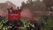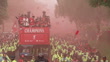 Premier League: Liverpool victory parade; ENGLAND: Merseyside: Liverpool: EXT Various shots of Liverpool FC football players on open-top bus past cheering crowds - victory parade to celebrate winning Premier League (filmed from bus travelling ahead of Liverpool bus). Including Alisson Becker, Mohamed Salah, Curtis Jones, Diogo Jota, Harvey Elliott
