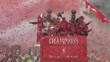 Premier League: Liverpool victory parade; ENGLAND: Merseyside: Liverpool: EXT Various shots of Liverpool FC football players on open-top bus past cheering crowds - victory parade to celebrate winning Premier League (filmed from bus travelling ahead of Liverpool bus) - players holding up Premiership trophy. Including Dominik Szoboszlai, Trent Alexander-Arnold, Mohamed Salah, Curtis Jones, Luis Diaz, Darwin Nunez