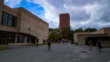 Lockdown time lapse shot of male and female students entering college campus under cloudy sky - University in United States