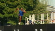 British Long Jump Champion J.J. Jegede jumping successfully over three mini cars and applause from spectators