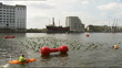 London Triathlon 2011; ENGLAND: London: Docklands:EXTSwimmers setting off at start of London TriathlonFemale triathletes wheeling bicycles into changeover areaTriathlon competitors running in running section of raceVox popTriathlete helped into his wetsuitVox popDominic West (Actor) along towards triathlon start (wearing wetsuit and bathing cap)Jean-Christophe Novelli (Chef / Triathlete) interview SOTTriathletes swimming in dock areaINTReporter to cameraEXTTriathletes along on racing bicyclesTriathletes running in 10k raceINTSky Draper (Female Triathlete) crossing finish line (in first place?) and interview SOTTriathletes crossing finish lineFemale triathlete at end of race with pack of ice on her headEXTTriathletes competing in swimming section of raceINTMale triathlete crossing finish line