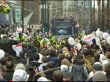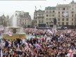 Fans waving flags & shouting next Trafalgar Square fountains PAN
