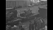VS longshoremen work with artillery guns after they are offloaded from a US transport ship / VS offloading / guns on dock train / VS gun rises from ship hold as crane hoists it, move it to dock / gun muzzle silhouetted against sun / US, French military personnel and French Defense Minister Rene Pleven (tall man in hat) on dock / Note: exact day not known