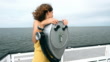 Girl looking though coin operated binoculars on free public ferry service to the Outer Banks in North Carolina.