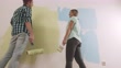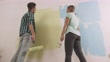 Panning shot of happy young couple standing in front of a wall they just applied paint onto and looking if they like the shade.