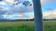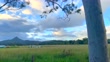 Horizontal landscape of rural tall grass meadow field with big white wood love sign at Mt Chincogan mountain on distant horizon and eucalyptus trees in foreground with sunlight cloudscape at Mullumbimby Byron Bay Area NSW Australia e