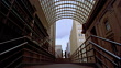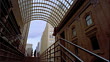 Low angle long shot two businesspeople standing on walkway with glass ceiling / Denver Performing Arts Complex - HD stock video