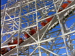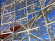 Low angle red roller coaster passing camera on track - stock video