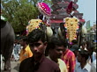 Low angle view of adorned elephants being led through the street during the Thrissur Pooram elephant festival / Thrissur, Kerala, India - stock video