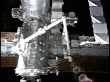 2005 low angle view of the International Space Station with the Canadarm2 robotic arm in foreground / STS-114