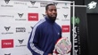 LONDON, ENGLAND - SEPTEMBER 27: (EDITORS NOTE: audio/music licensing is not included.) Lutalo Muhammad poses against the photoboard during the "Pro Am Padel Tour" photocall at Rocket Padel at Battersea Power station on September 27, 2024 in London, England. (Footage by David Sampedro/Getty Images)
