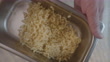 Al dente boiled and drained elbow macaroni in stainless steel kitchen tray. High point of view.