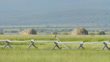 Wide shot of a solitary black-billed magpie (Pica hudsonia) perches on the centre of a wooden fence with two large haystacks in the background as field and mountains continue into the distance, Wyoming, USA (FKAD627H - Clip taken from programme rushes - 333938)
