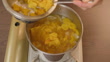 close view of pour the roasted butternut squash into a boiling pot for making butternut squash soup