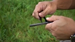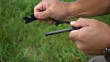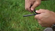 Slow motion shot of human hand igniting fire starter with ferrocerium rod in camping