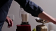 Man making white gazpacho at home. He opens a new bottle of sherry vinegar, then adds it to the blender.