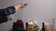 Man making white gazpacho at home, adding almonds to the blender, then pressing 'pulse' twice.