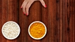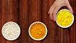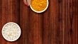 Animation of female hand offering bowls with boiled rice and turmeric to illustrate the making process of yellow rice