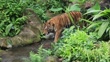 Malayan tiger (Panthera tigris tigris), adult stalking in water, captive, Singapore, Asia